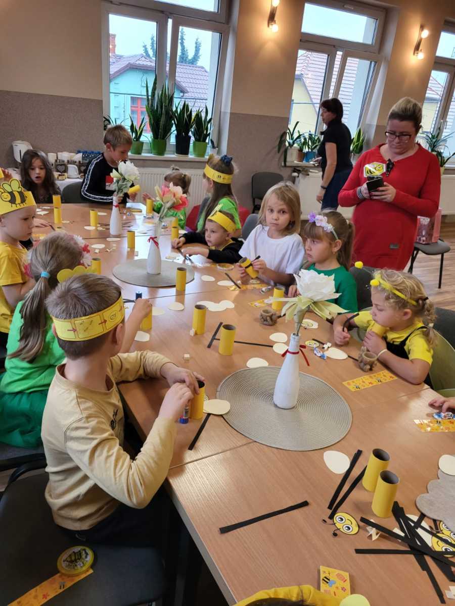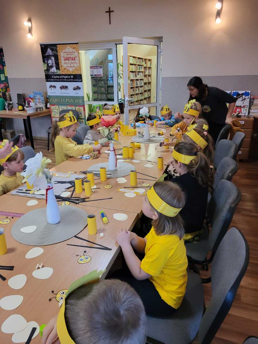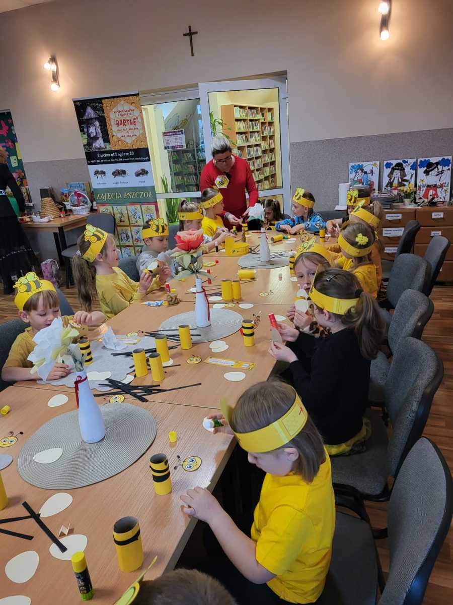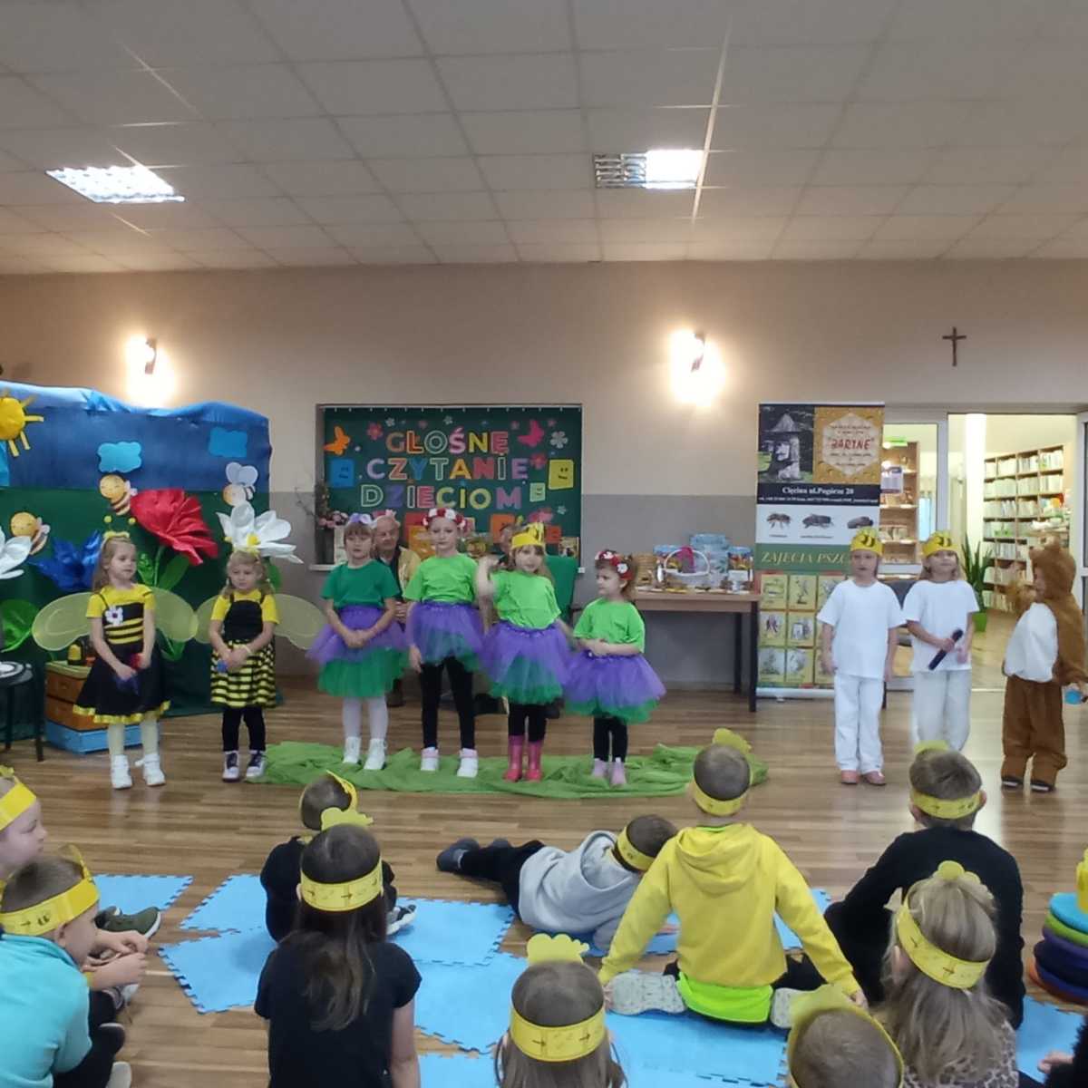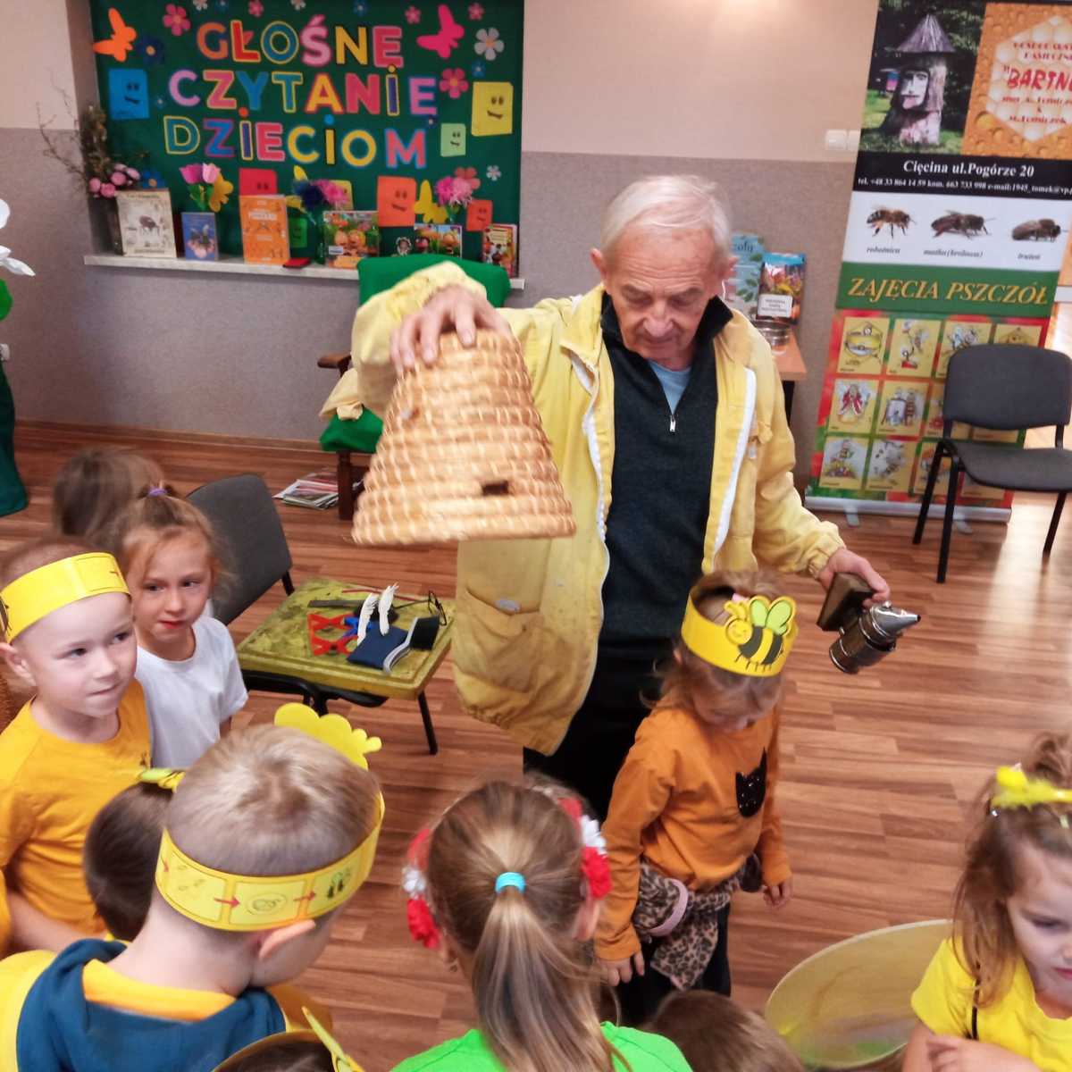 Ale również nasze przedszkolaki wybrały się gdzieś z wizytą- do biblioteki, na specjalne zajęcia! Temat zajęć brzmiał: „Pszczelarze czytają dzieciom”. Zaproszone osoby czytały dzieciom piękne opowiadania i dzieliły się różnymi ciekawostkami na temat pszczół.