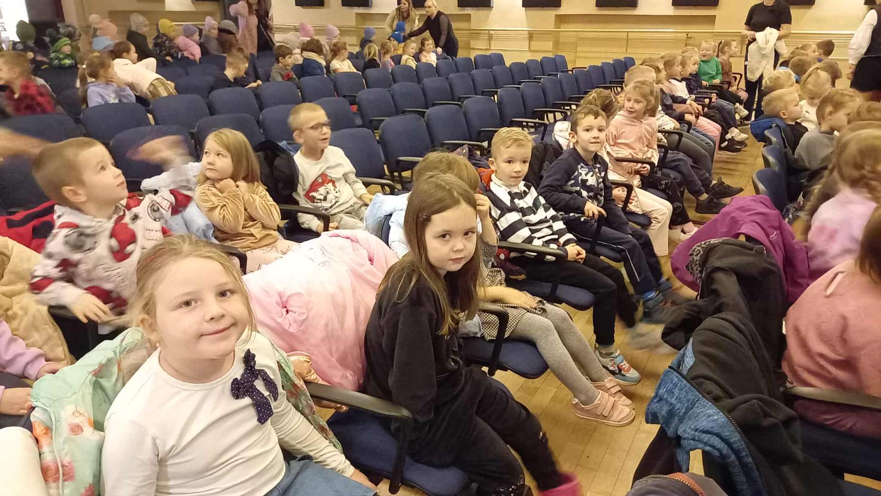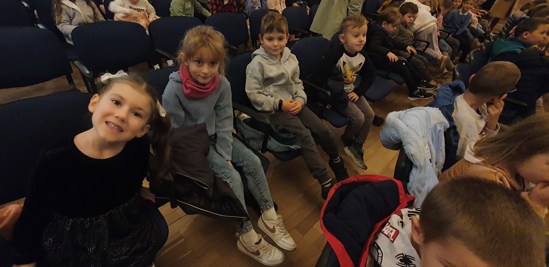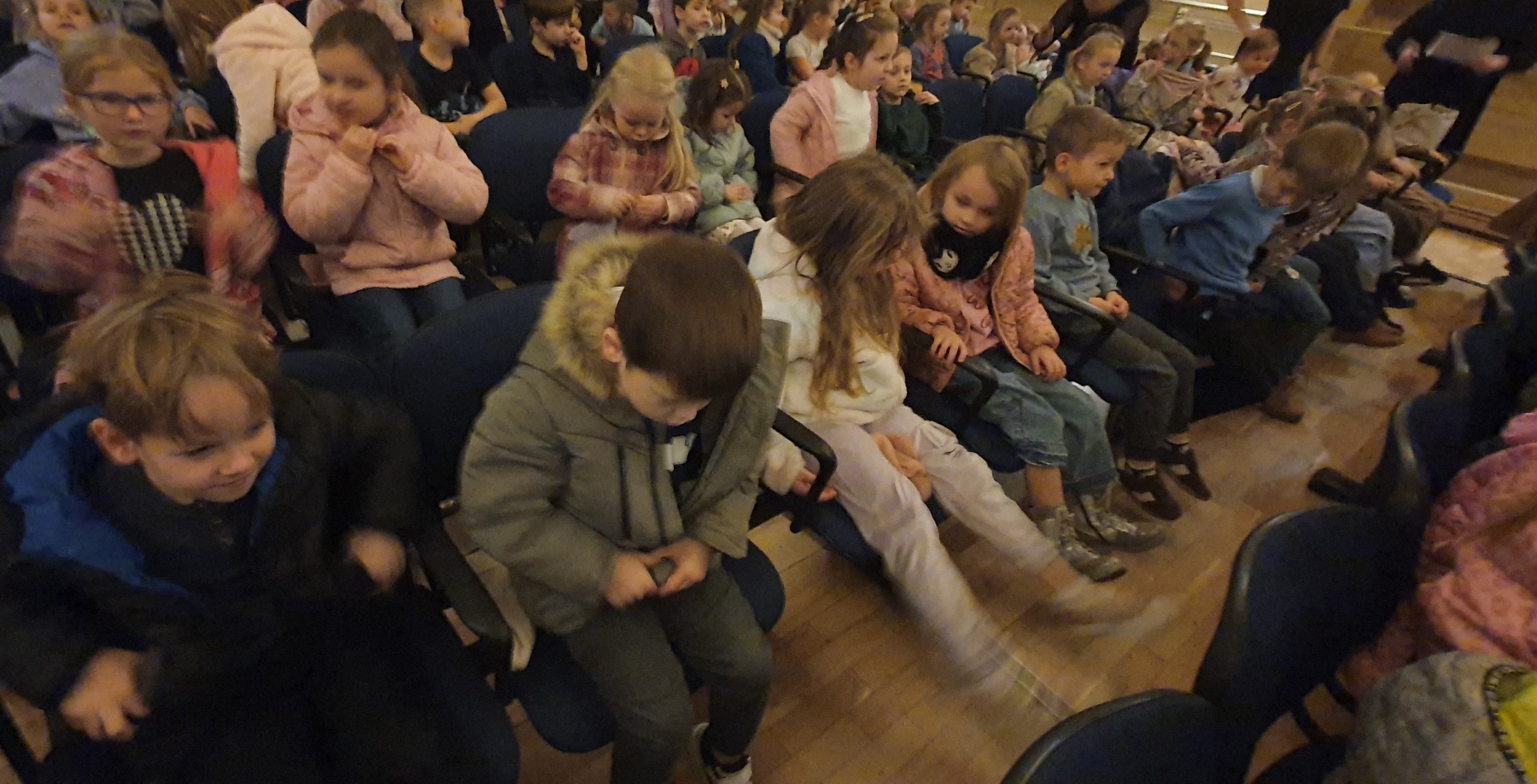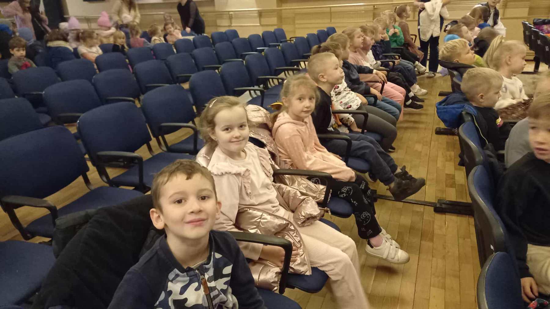 Dziś grupy Wiewiórki 🐿, Muchomorki 🍄 i Jeżyki 🦔 wybrały się do Miejskiego Centrum Kultury w Żywcu na spektakl muzyczny pt. „Królestwo Małych Serc” 😊.